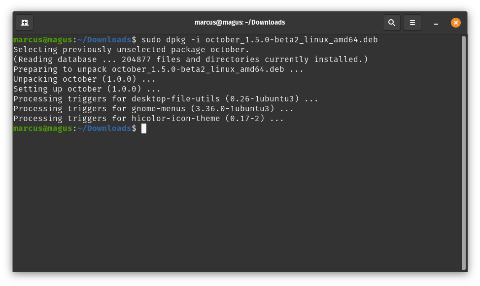 $ sudo dpkg -i ~/Downloads/october_x.x.x_linux_amd64.deb