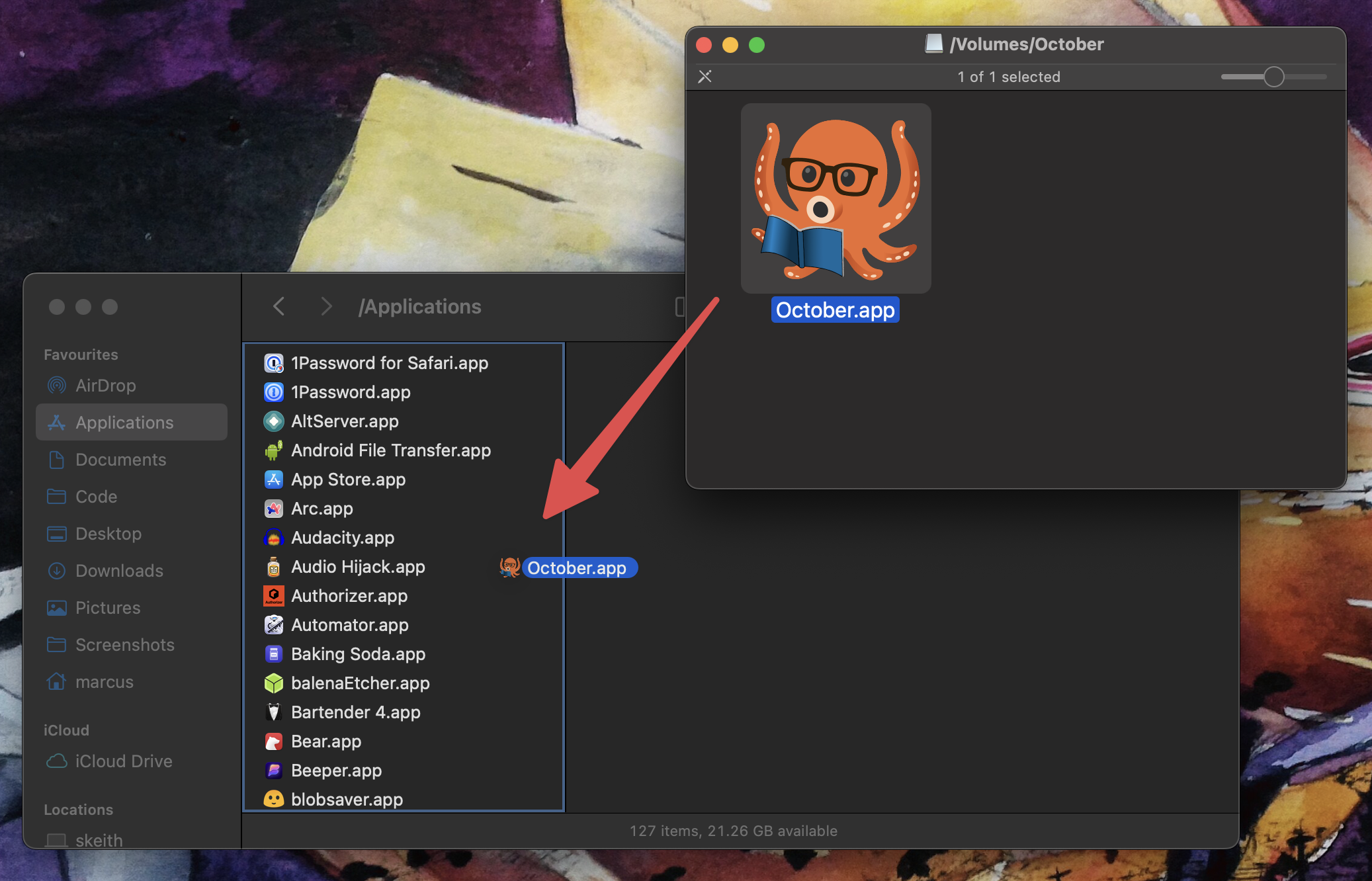 From here, you'll want to drag October.app (from the small popup window) into your Applications folder like so: