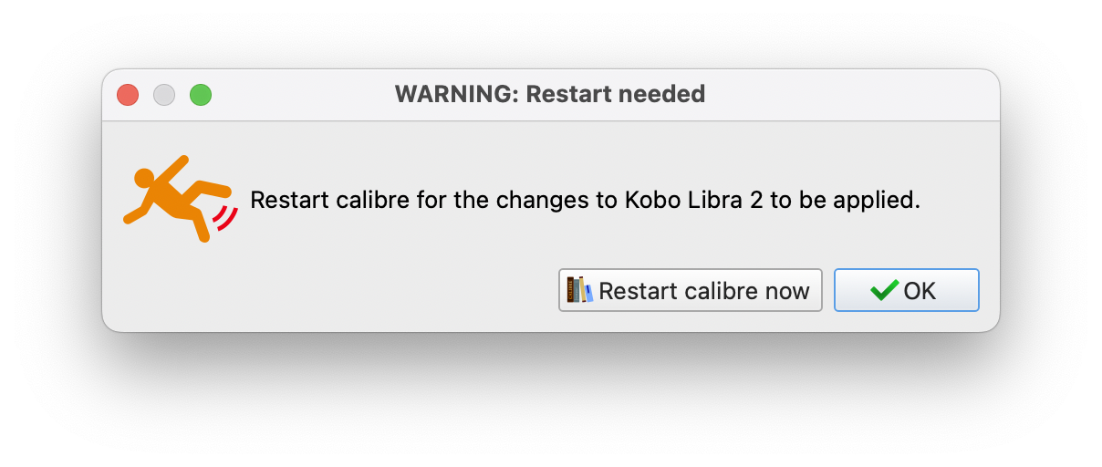 Once that's done, you'll see a dialogue box pop up saying that you'll want to restart Calibre in order to apply your changes.