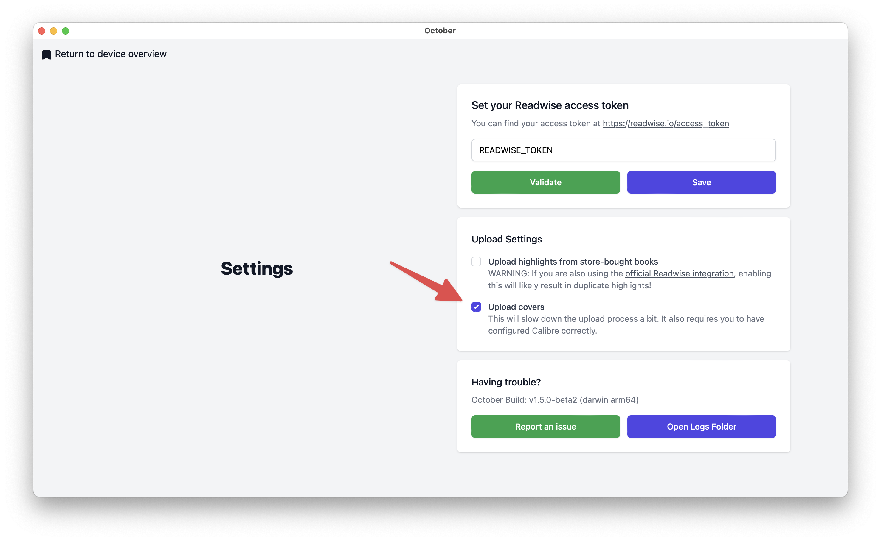 You can find the cover upload toggle in October under the "Settings" button in the top left once you've selected your Kobo.